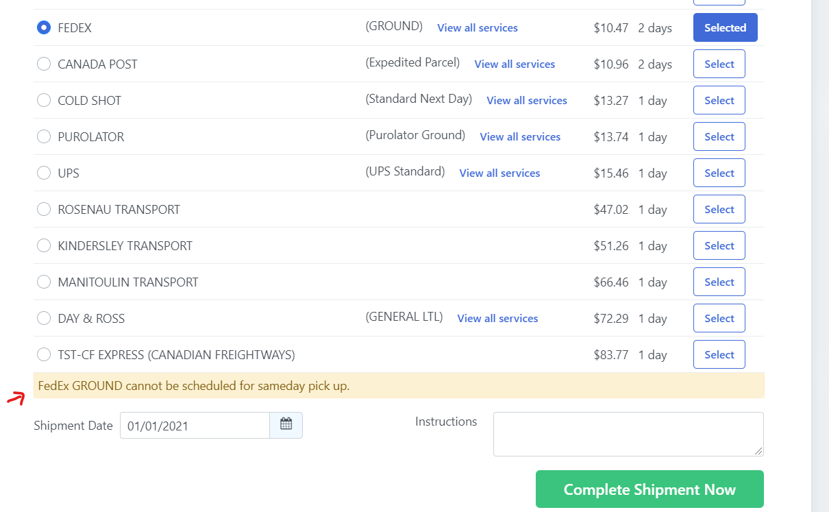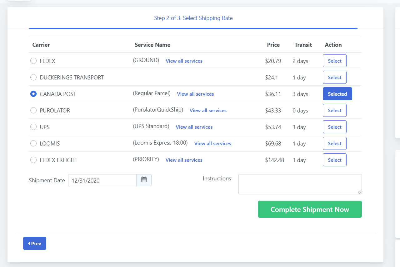 Order shipment screen has new changes. Now carrier rate listing does not have "Buy Label" button. User will need to select that carrier record and will need to click "Complete Shipment Now" button in order to complete shipment booking.